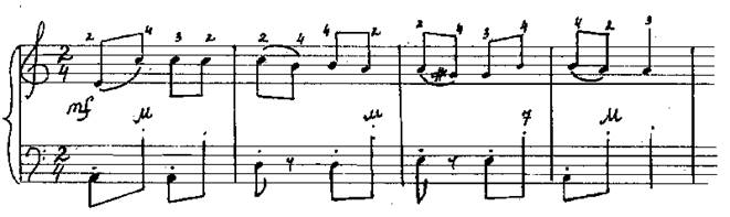 Здесь такая смена направления не только возможна, но и необходима, так как без каких – либо специальных усилий вносится нужное различие в исполнение повторяющихся звуков: первый, как и требуется, будет звучать слабее, второй ярче.