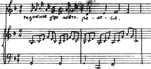 Романс написан на бессмертные стихи А.С. Пушкина. Спрашиваю у студентки, какие еще вокальные и хоровые произведения на стихи Пушкина она знает. Подумав, называет несколько. Студентке романс нравится, работает над ним увлечённо, с нескрываемым удовольствием. Стремясь как можно скорее исполнять романс в нужных темпах и в образе, учащаяся недостаточно чутко отнеслась к ритмическим особенностям аккомпанемента, вследствие чего во время домашней подготовки образовалась стойкая погрешность при исполнении пунктирного ритма в триольном размере и синкопы.