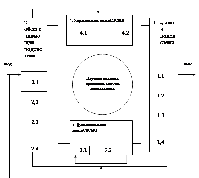 Только для условий правового государства с развитыми и устоявшимися рыночными отношениями можно с достаточной точностью спрогнозировать изменения параметров этих подходов. Для экономики с формирующимися рыночными отношениями рационально учесть требования административного, поведенческого и ситуационного подходов только применительно к лицам, принимающим стратегические решения, и к организации разработки объектов, но не к прогнозируемым параметрам объектов. В современной теории управления структура системы менеджмента представляется в виде модели показанной на рисунке 1.2. следует обратить внимание, что автор этой модели в центр системы ставит научные подходы, принципы и методы менеджмента.