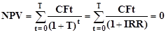 3) внутренняя ставка дохода – это такая норма процента, при которой настоящая стоимость рассматриваемого инвестиционного проекта равна нулю, то есть внутренняя норма дохода – это такая форма дисконта, которая уравнивает дисконтированный поток доходов (в денежном выражении) с величиной инвестиционных затрат, при которой выполняется условие: