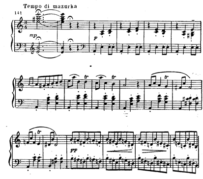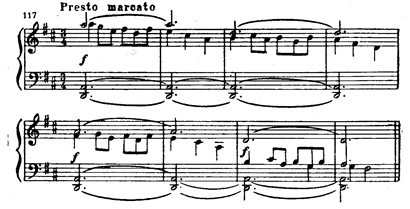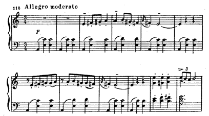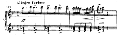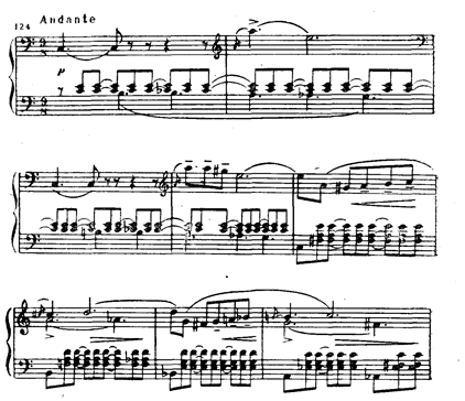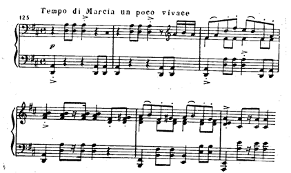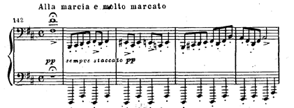 Свои контрасты есть и в крайних разделах формы, также трехчастных. Середина вызывает в представлении танцевальную сценку с противопоставлением энергичного мужественного движения и легких грациозных “па”. Огромное нарастание мощи звучания, активности движения приводит к яркой, звонкой репризе, к кульминационному проведению темы, словно приподнятой предшествовавшими ей сильными, мощными аккордами.