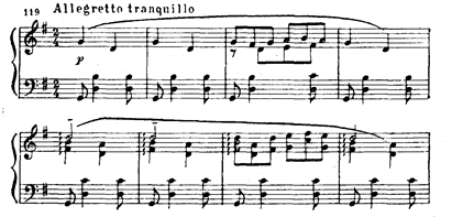 “Листок из альбома” соединяет непосредственность лирического чувства с изяществом, “галантностью” альбомного стихотворения. В безыскусной мелодии этой пьесы слышны интонации народной песни. Но легкая, воздушная орнаментика сообщает изысканность этой простой мелодии. Последующие циклы “Лирических пьес” привносят новые образы и новые художественные средства. “Колыбельная” из второй тетради “Лирических пьес” звучит как драматическая сценка. Ровная, спокойная мелодия складывается из вариантов простой попевки, словно выросшей из мерного движения, покачивания. С каждым новым проведением ее усиливается ощущение покоя, света:
