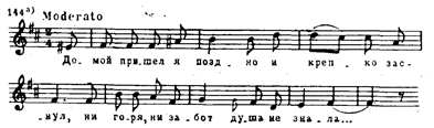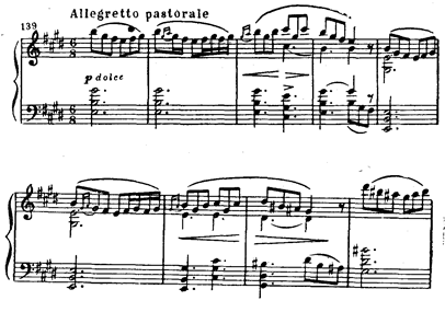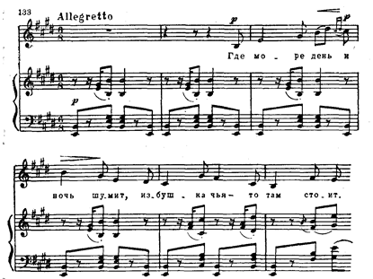“Чистые” гармонические краски (трезвучие — основной вид гармонии), яркие, неожиданные в сопоставлении друг с другом (Е, Gis, Н), воспринимаются как краски в живописном пейзаже. При каждом новом повторе наигрыша появляются мелодические варианты, которые связывают сходные фразы в единую мелодию. В насыщенном, широком по диапазону звучании струнной группы эта