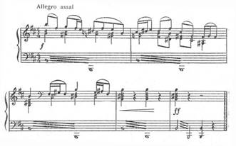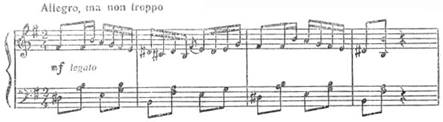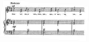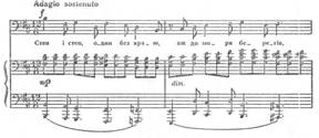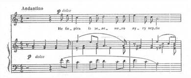 Починається романс не з тоніки, а з VIступеня. Специфічну барву вносять септакордові структури, плагальні звороти. Завершується перша фраза на тоніці, яка з'являється на слабій долі. У фортепіанній партії звучить канонічна імітація. Отже, складність образу, його психологічна насиченість створюється комплексом засобів. У такому ж ключі витримується весь романс – мелодія розгортається невеликими за амплітудою побудовами, в гармонії зустрічаємо ряд септакордів, плагальних зворотів, незмінним залишається і фактурний, акомпануючий пульс (синкопами) та канонічна імітація в приму.