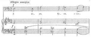 Середня частина романсу Allegroenergico – епіко-драматична. Активізація розміреної оповіді, переведення її в дію зумовлені задумом твору. Мелодію витримано в характері епічної танцювальності, її підтримує фортепіано повнозвучними акордами; особливо активною є басова лінія, що проводиться октавами у низькому регістрі. Образ степу-богатиря, що, прокинувшись від сну, «грому груди підставля», символізує образ пригнобленого народу, який піднявся на боротьбу. Композитор вірить у його велетенську силу і міць (Додаток 4).
