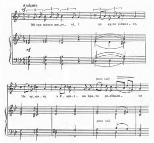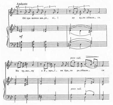 Тема обездоленого народу досить часто звучить у творчості Лисенка, а згодом і в музиці композиторів молодшої генерації – Стеценка, Леонтовича, Людкевича і Степового. Романс «Ой три шляхи широкі» написано в лірико-драматичному плані. Його перша частина має ряд інтонаційних особливостей, що походять від дум: рецитація, специфічні ладові звороти (мінливий характер IV ступеня ладу, вживання VII натурального вгорі й VII підвищеного внизу у мінорі, використання акордів з цими ладовими особливостями тощо). При дуже виразній мелодії тут досить скромна фортепіанна партія. На початку вона дещо нагадує гру на бандурі (Додаток 6).