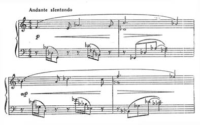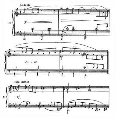 Середня частина романсу (Росо rnenomosso) вносить певний контраст. Тут розгортання музичної тканини стає спокійнішим, мелодія – плавністю, фортепіанна партія характеризується заколисуючим рухом, властивим ноктюрнові чи колисковій. Однак гострота залишається через дисонантність гармонії.