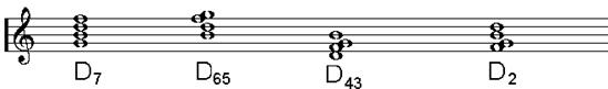 Обращение можно получить, перенеся нижний звук аккорда на октаву вверх. Собственно, необязательно на одну октаву. Главное, чтобы нижним звуком стал другой тон аккорда. Названия обращений септаккорда образуются от двух интервалов: между нижним звуком и примой аккорда, и между нижним звуком и септимой аккорда.
