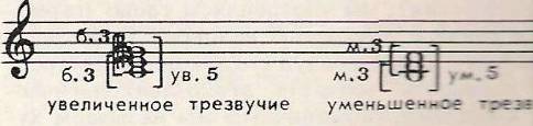 Однако мажорным и минорным не исчерпываются встречающиеся в музыкальной практике трезвучия. Две одинаковые терций (а не разные, как до сих пор) дают другие варианты трезвучий: две большие — увеличенное трезвучие, две малые — уменьшенное.