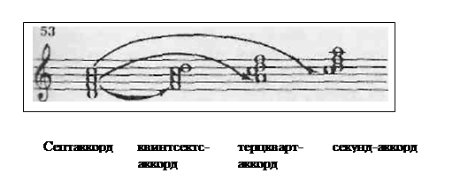 Таким образом, трезвучие одного и того же звукового состава может — с помощью разных расположений и обращений — дать целую серию выразительных оттенков. Естественно, что обращения септаккордов несут еще больше различных нюансов. Этих обращений три: