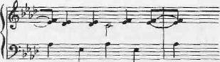 Применение разных обращений трезвучий и септаккордов кроме всего прочего помогает композитору достичь плавного ведения голосов. Если ми обратимся к теме финала Пятой симфонии Бетховена (пример 50), то увидим, что и мажорное трезвучие и малый мажорный септаккорд применяются здесь в основном виде, без обращений. Бас при этом движется большими скачками, что тоже способствует созданию решительного, мужественного характера теми. Напротив, плавное ведение баса обычно связано с применением обращений аккордов и почти всегда — с более мягким характером звучания (см. движение баса в примерах 74 о и 193).