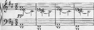 Однако при всех нюансах восприятия диссонансов их значение и смысл в классической музыке не меняется; не меняется и закономерность движения от диссонанса к консонансу. Лишь в нашем столетии диссонанс становится более автономним — не только не требует разрешения, но и подчас вьшолняет роль тех устойчивых опор в музыке, которые ранее выполняли только консонансы. В определенных условиях мы воспринимаем некоторые диссонирующие сочетания как самостоятельные, не обязательно вызывающие за собой появление консонанса. Например, тогда, когда усложняется добавочными (так называемыми неаккордовыми) звуками основное трезвучие, с которого обычно начинается произведение. Например, в пьесе Дебюсси «Кукольный кэк-уок»[1] 1 еще до вступления мелодии главной темы звучит танцевальный аккомпанемент, в основе которого — усложненное диссонирующими наслоениями трезвучие тональности ми-бемоль мажор: