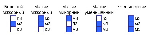 Правило побочных ступеней (II, III, VI, VII): трезвучия побочных ступеней не соответствуют основному ладу, то есть в мажоре они будут - минорные (+ одно уменьшенное), а в миноре - мажорные (+ одно уменьшенное).