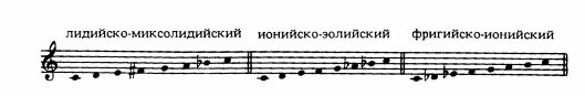 Как видно из схемы (см. Приложение №3) три лада имеют мажорное наклонение, четыре - минорное, причём из этих четырёх выделяется локрийский, в структуру которого входит уменьшённая квинта от тоники.