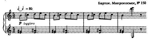 Пентатонические напевы Барток относит к древнейшему пласту венгерской народной музыки. Примером использования пентатоники является фортепианной миниатюры № 107из цикла "Микрокосмос". (см. Приложение №5)