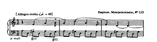 Новые структурные варианты диатонических ладов в современной музыке связаны с их индивидуально-стилевой трактовкой, при которой возрастает число "именных" ладов. Своеобразие последних проявляется в добавлении специфических высоких или низких ступеней. Так, характерной выразительностью обладает лад Бартока - натуральный минор с высокими IVи VIступенями. Композитор использует его в пьесе № 113 "Болгарский ритм" из цикла "Микрокосмос". (Схема и пример см. Приложение №15)