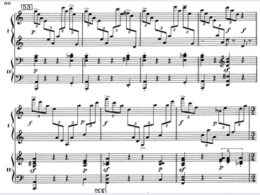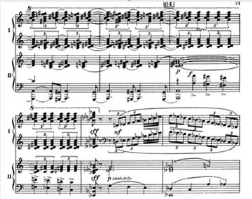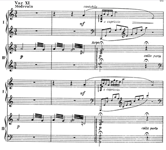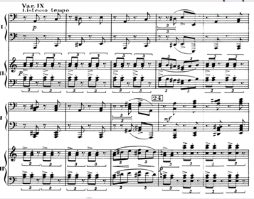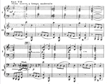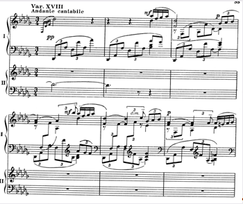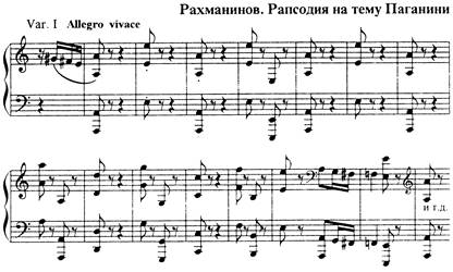 При варьировании возникают такие варианты темы, которые сами становятся темами для будущего варьирования, например XIV и XV вариации, XVIII – лирическая кульминация всего цикла – является вариацией на XIV и, одновременно, явно производна от главной темы (обращение). Тема Паганини очень быстро становится темой Рахманинова, то есть, поглощается, ассимилируется авторским стилем. Даже "скрипичные" приемы игры на фортепиано не обманут слушателя – гармония и фактура в целом остаются рахманиновские (пример 1).