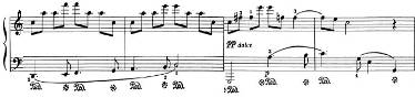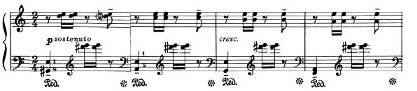 Начало следующего построения основано на субдоминантовых гармониях (аккорды II и VI ступени). Плагальность этого оборота придает звучанию мягкость и не конфликтность. Это последовательность приводит к кульминации особого рода – «тихой кульминации» (вместо привычных нам ff композитор вводит pp и dolce ). Остроту гармонии придаёт аккорд, введённый самим Прокофьевым – так называемая «прокофьевская доминанта» (доминантовый нонаккорд с повышенной септимой), который благополучно разрешается в тонику.