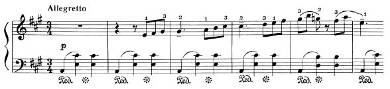 Теперь тема прытких кузнечиков перемещаются в басовую партию. Что касается функционального плана этого предложения, − он является неизменным по отношению к первому (T–ум DDVII2 →SII6 −D−T).