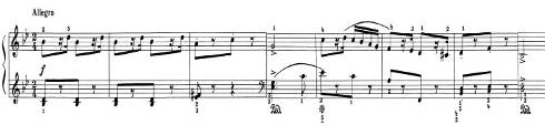 Первый четырёхтактовый мотив основан на тонической гармонии, но слушателю скучать не приходится, так как характер произведения задаёт темп и ритм. Эти 4 такта проносятся мимо нас ярко и молниеносно. Следующий мотив аналогичен первому почти во всём: и по количеству тактов, и по гармонии, и по мелодии.