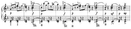 Следующий раздел средней части – возвращение основной темы. Для равновесия формы вслед за ним Прокофьев повторяет ай эпизод (С), но в более высоком регистре. При этом разрешение акцентированных аккордов происходит с нарушением правил голосоведения, на расстоянии.