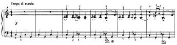Следующий за ним эпизод маршевого характера (С) сочетает в себе элементы мажора и минора с тоникой До. Яркие акценты, смещённые на 2-ю долю, усиливаются полифункциональностью (сочетание S и D). В конце построения оба разноплановых аккорда одновременно разрешаются в тонику, причём несколько раз, подчеркивая кадансность оборота. В данном цикле этот приём встречается впервые.