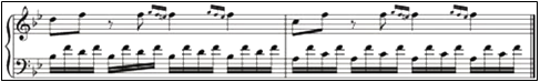 Побочная партия ритмически близка Главной и Связующей. Она в B-dur состоит из двух одинаковых предложений в верхнем и среднем регистрах.