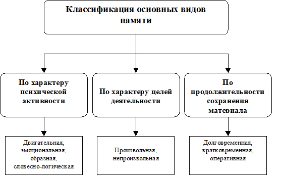 Существует несколько основных подходов в классификации памяти. В настоящее время в качестве наиболее общего основания для выделения различных видов памяти принято рассматривать зависимость характеристик памяти от особенностей деятельности по запоминанию и воспроизведению.