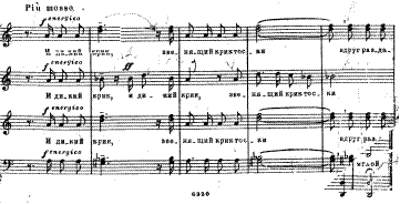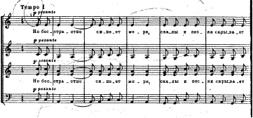 Хотелось бы обратить внимание на первые слова хора. Весомое, глубокое высказывание является интонационным ядром, которое погружает слушателя в мрачную атмосферу хора. Звучание каждого аккорда композитор усиливает акцентом:
