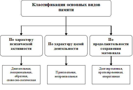 Существует несколько основных подходов в классификации памяти. В настоящее время в качестве наиболее общего основания для выделения различных видов памяти принято рассматривать зависимость характеристик памяти от особенностей деятельности по запоминанию и воспроизведению.