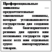 Преференциальные пошлины предоставляются на началах взаимности или в одностороннем порядке, но без распространения принципа наибольшего благоприятствования на третьи страны. Широко используются странами с развитой рыночной экономикой.