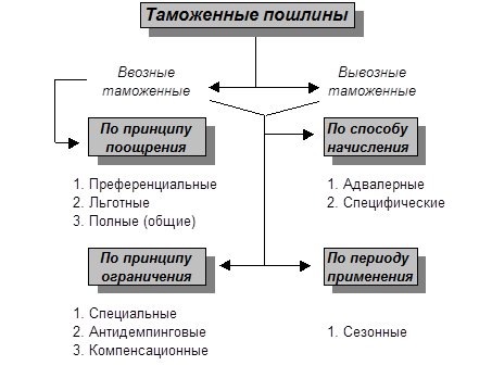 Исходя из принципа ограничения импорта (экспорта) в отдельных случаях при ввозе (вывозе) на таможенную территорию Украины независимо от других видов таможенных пошлин могут применяться следующие виды: специальные, антидемпинговые, компенсационные пошлины:
