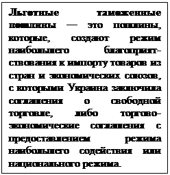 Допускается установление преференций по ставкам Единого таможенного тарифа Украины в виде освобождения от обложения таможенной пошлиной, снижения ставок пошлин или установления квот на преференциальный ввоз в отношении иностранных товаров, происходящих из государств, образующих с Украиной таможенный союз или зону свободной торговли.