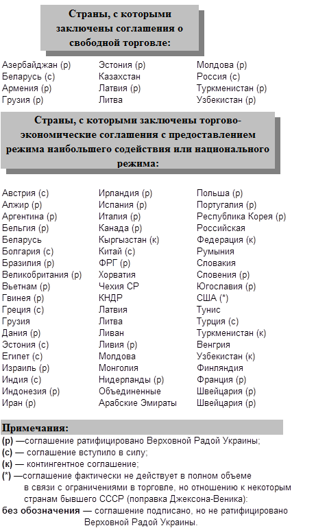 В настоящее время действует перечень стран, с которыми Украиной заключены соглашения о свободной торговле и торгово-экономические соглашения с предоставлением режима наибольшего благоприятствования или национального режима. При ввозе на таможенную территорию Украины товаров и других предметов, происхождением из указанных в перечне стран, применяются льготные ставки ввозной пошлины (табл. 1).