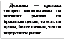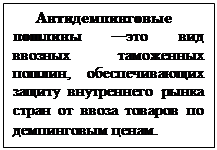 законы (в США – в 1921 г., Великобритании—1957, Франции—1958, ФРГ— 1962, Италии— 1963 г.), которые различаются по трактованию понятия демпинга, правилам взимания и расчета антидемпинговых пошлин. Антидемпинговые пошлины, как правило, взимаются с импортных товаров либо реализуемых по бросовым ценам, либо ввозимых из стран, субсидирующих экспорт. Антидемпинговые пошлины повышают цены на иностранные товары на внутреннем рынке. Поэтому использование этих пошлин обостряет противоречия между странами и приводит к таможенным войнам. Предпринимаются попытки выработать международные соглашения, регулирующие применение антидемпинговых пошлин. В 1947 г. принято Генеральное Соглашение по Тарифам и Торговле (ГАТТ), в 1967 г.— Антидемпинговый кодекс, в котором приводятся определение демпинга и методика расчета антидемпинговых пошлин. Согласно требованиям ГАТТ использование антидемпинговых пошлин разрешается в случае, когда демпинг наносит материальный ущерб национальной промышленности страны. Ухудшение экономического положения стран в 70-х годах вызвало резкое обострение конкурентной борьбы между монополиями США, стран ЕЭС и Японии. В этих условиях стали широко применяться антидемпинговые пошлины для ограничения импорта из стран-конкурентов. Так, страны ЕЭС в конце 70-х годов ввели антидемпинговые пошлины в размере 10—20% на импорт японских подшипников, а в конце 1980 — временные антидемпинговые пошлины на некоторые товары химической промышленности США, экспортируемые по демпинговым ценам. В августе 1980 г. США подняли с 4 до 25% пошлину на японские малогабаритные грузовики, что положило начало автомобильной войне между этими странами.