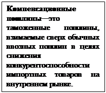 Компенсационные пошлины применяются в целях снижения конкурентоспособности импортных товаров на внутреннем рынке и тем самым играют протекционистскую роль. В условиях резкого обострения проблемы сбыта иностранные поставщики, широко пользуясь в своей стране государственными субсидиями, стали искусственно повышать конкурентоспособность экспортируемых товаров путем снижения цен.