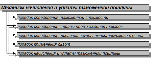 Механизм начисления и уплаты таможенной пошлины включает в себя несколько элементов, таких как порядок определения контрактной стоимости товара, порядок определения страны происхождения товара, порядок определения товарной группы импортируемого товара, порядок применения льгот, если таковые предусмотрены для данного товара, порядок начисления и уплаты таможенной пошлины (рис.3).