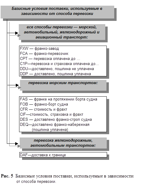 При определении таможенной стоимости необходимо учесть базисные условия поставки, которые используются в зависимости от способа перевозки товара и иных предметов. Они представлены на рис. 5.