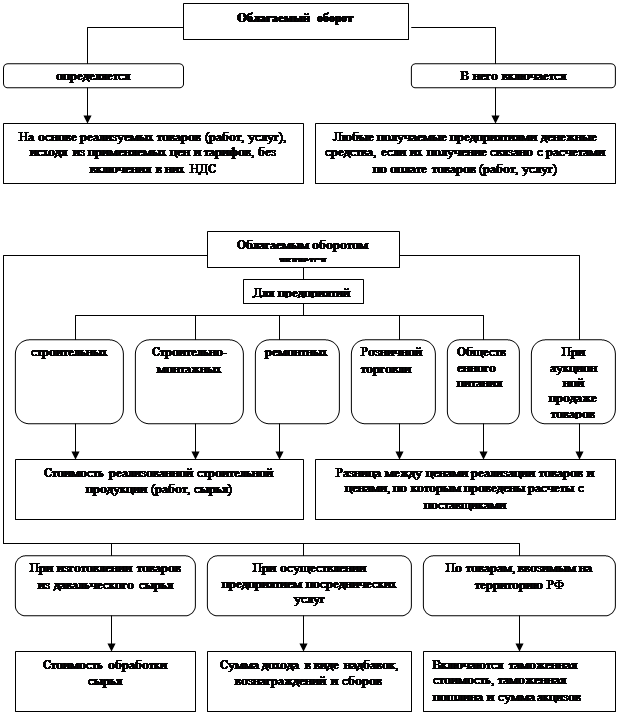 Облагаемый оборот[Приложение 1, схемы 1.1, 1.2] определяется на основе стоимости реализуемых товаров (работ, услуг) исходя из применяемых цен и тарифов без включения в них налога на добавленную стоимость. В облагаемый оборот включаются также суммы денежных средств, полученные предприятиями за реализуемые ими товары (работы, услуги) в виде финансовой помощи, пополнения фондов специального назначения или направленные в счет увеличения прибыли; суммы авансовых и иных платежей, поступивших в счет предстоящих поставок товаров или выполнения работ (услуг) на расчетный счет, и суммы, полученные в порядке частичной оплаты по расчетным документам за реализованные товары.