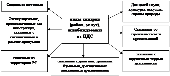 От НДС освобождаются: экспортируемые товары (работы, услуги); услуги пассажирского транспорта; квартирная плата; некоторые финансовые операции, патентно-лицензионные операции, продукция собственного производства отдельных предприятий общественного питания, а также тех, кто обслуживает социальную сферу; услуги в сфере образования; научно-исследовательские и опытно-конструкторские работы, финансируемые из бюджета; услуги учреждений культуры; платные медицинские услуги; продукция сельскохозяйственных предприятий, реализуемая в счет натуральной оплаты труда; изделия народных художественных промыслов; некоторые виды товаров, ввозимых на территорию Российской Федерации [приложение 1, схема 2]; лица, занимающиеся предпринимательской деятельностью без образования юридического лица. Перечень товаров (работ, услуг), освобождаемых от НДС, является единым на всей территории РФ, устанавливается законодательными актами и не может быть изменен решениями местных органов государственной власти.