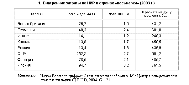 Глобальной тенденцией прошедшего десятилетия стало наращивание научных расходов и государством, и корпорациями, преодоление "застойности" показателей общей наукоемкости ВВП (отношение национальных расходов на исследования и разработки к ВВП). За период с 1993 по 2003 г. общие затраты на научные исследования и разработки в развитых странах (около 30 стран Организации экономического сотрудничества и развития - ОЭСР) увеличились с 418 до 558 млрд. долл., что означает рост средней наукоемкости с 2,1 до 2,4% ВВП [1].