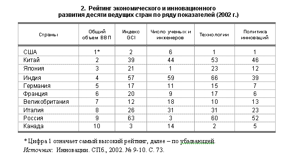 Во-первых, экономика России сейчас занимает девятое место в мире и в соответствии с приведенной таблицей опережает только Канаду. Во-вторых, что более существенно, ясно виден наш разрыв по большинству качественных показателей роста. Так, если Россия еще опережает Китай и Индию по показателям ВВП в расчете на душу населения, то уже отстает от них по индексу инновационной способности. Этот разрыв, как показывают рейтинги ВЭФ, говорит о потенциале ускорения развития экономики для Китая и Индии и, наоборот, об угрозах экономическому росту России в ближайшем будущем. В-третьих, если РФ и имеет значительное преимущество по сравнению с большинством стран мира по численности научно-исследовательских кадров, то этот количественный показатель практически не оказывает влияния на перспективы экономического роста страны.
