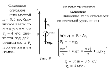 Мы уже говорили, что физики при изучении природных процессов создают их теоретическую модель – образ, описанный на языке теории. Такое описание бывает двоякое: словесное и математическое. Например, полет мяча, подкинутого вверх, может быть описан так.