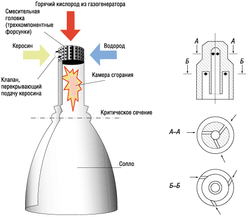 Смелость отечественных конструкторов заключалась в том, что в первом режиме они решились одновременно подать в одну камеру сгорания три различных компонента и сжечь их вместе. (До сих пор ни одной двигателестроительной фирме мира не удавалось этого сделать, одновременно добившись устойчивого режима горения.)
