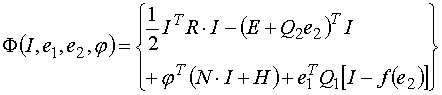 Таким образом, при соблюдении условия (7) в электрической цепи достигается глобальный минимум некоторой выпуклой функции (6) токов I, потенциалов и напряжений E электрической цепи. Все эти выводы справедливы и в том случае, когда она содержит трансформаторами Денниса и диоды. Последнее означает, что математическая модель (1-4) электрической цепи с ОП может быть дополнена неравенствами вида (1.5-1.7):