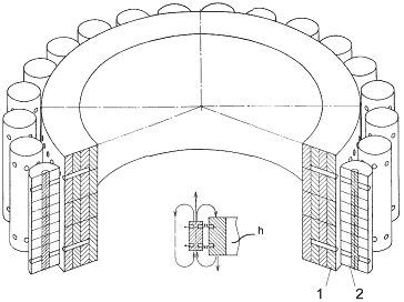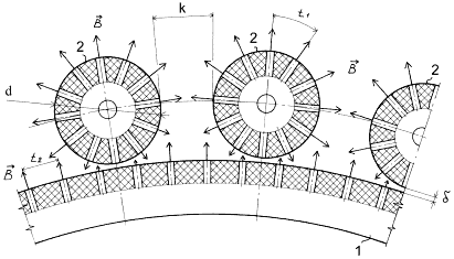 Высокочастотное подмагничивание не применялось. Технологию импринтинга, описанную в [1], было решено заменить применением поперечных магнитных вставок с вектором намагниченности, направленным под углом 90 градусов к вектору основной намагниченности статора и роликов. Для этих поперечных вставок использовался модифицированный материал NdFeB с остаточной индукцией 1,2Тл с коэрцитивной силой и магнитной энергией несколько большей Нс≈1000кА/м; W≈360кДж/м3 чем в базовом материале рабочего тела. На рис.1 и рис.2 изображено совместное расположение статора 1, элементов ротора – роликов 2 и способ их взаимодействия посредством поперечных магнитных вставок на статоре и роторе по принципу шестеренчатого зацепления. Между поверхностью статора и роликами был оставлен воздушный зазор – δ, имевший величину около 1мм.