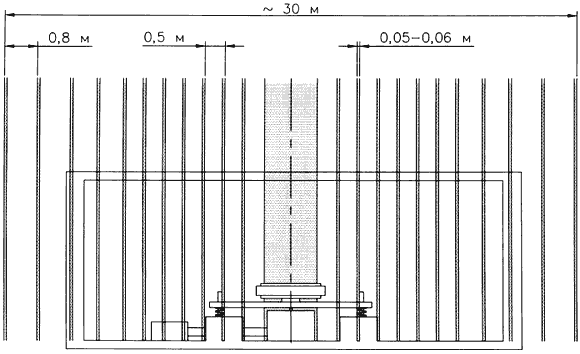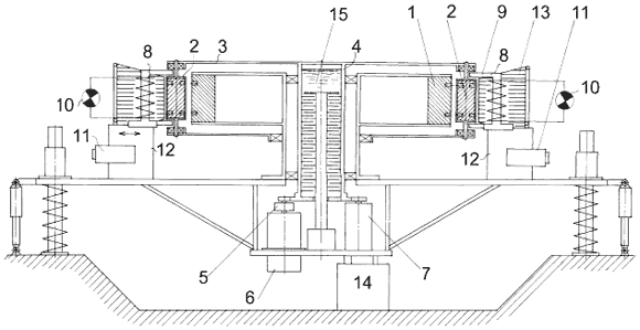 Элементы магнитной системы были собраны в единую конструкцию на платформе, собранной из немагнитных сплавов. На рис.3 изображен общий вид платформы с однорядным конвертором. Эта платформа была снабжена пружинами, амортизаторами и имела возможность вертикального перемещения по трём направляющим. Величина перемещения измерялась с помощью индукционного датчика перемещений 14, таким образом сразу определялось изменение веса платформы в процессе эксперимента. Общий вес платформы с магнитной системой в исходном состоянии составлял 350кг.