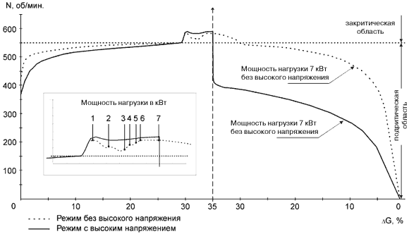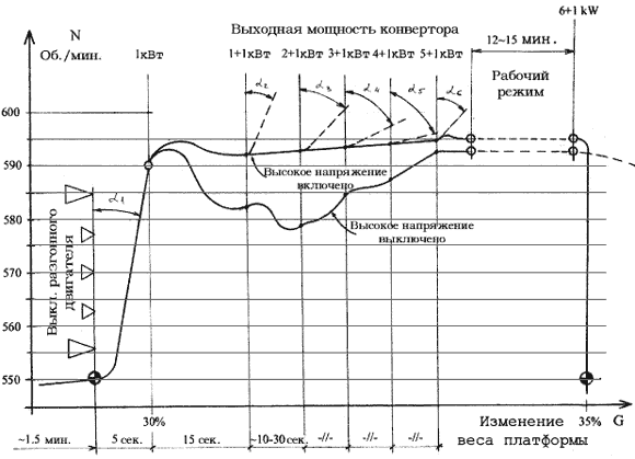 Всё вышесказанное относится к режиму с включённым высоким поляризующим напряжением 20кВ (плюс на «земле»). Без поляризующего напряжения (нижняя кривая) всё приблизительно то же, но отмечается меньшая «жёсткость» нагрузочной кривой и более быстрое изменение веса платформы при уменьшении скорости вращения ротора конвертора.