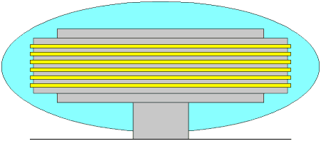 Наблюдался ещё один, ранее нигде не упоминавшийся эффект – это вертикальные концентрические магнитные стены вокруг установки. Было замечено и измерено с помощью портативного магнитометра Ф4354/1 (чувствительный элемент – датчик Холла в латунном экране) нормальное постоянное магнитное поле, окружающее конвертор. Выявлены зоны повышенной напряженности магнитного поля порядка 0,05Тл, расположенные аксиально от центра установки. Направление вектора магнитного поля в этих стенах совпадало с направлением вектора магнитного поля роликов. На рис.7 схематически показано расположение конвертора на первом этаже лаборатории и расположение концентрических магнитных областей вокруг него. Зона максимальной ширины располагалась точно по центру магнитной системы конвертора.