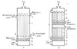 Схема абсорбера с восходящим движением пленки показана на (рис 4, а). Абсорбер состоит из пучка труб 1, закрепленных в трубных решетках 2. Газ подводится из камеры 3 через патрубки 4, расположенные соосно с трубами 1. Между верхними обрезами патрубков с нижними обрезами труб оставлены щели 5 , через которые жидкость поступает в трубы 1. Увлекаемая движущимся газом жидкость течет в виде пленки по внутренней поверхности этих труб снизу вверх. По выходе из труб 1 жидкость сливается на верхнюю трубную решетку и выводится из аппарата. В случае необходимости отвода выделяющегося при абсорбции тепла по межтрубному пространству пропускают охлаждающую жидкость, как показано на рис. 4, а.